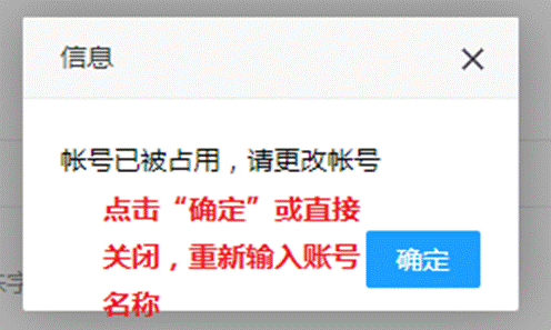 三、点击注册,若弹出以下提示框,则您输入的账号已经有人注册,被占用了,则需重新输入账号名称